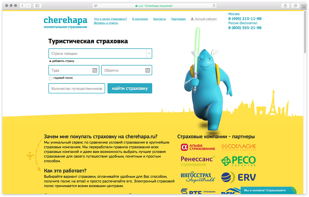 Увидев название этого сервиса в первый раз, я прочитал его как «черепаха». Однако поисковик выгодных туристических страховок cherehapa.ru настаивает на том, что он — полная противоположность этой рептилии. Быстрый поиск дешевых страховых полисов покрывает больше 10 страховых компаний и большинство стран мира. Пара кликов — и перед вами самая дешевая страховка, удовлетворяющая заданным условиям.