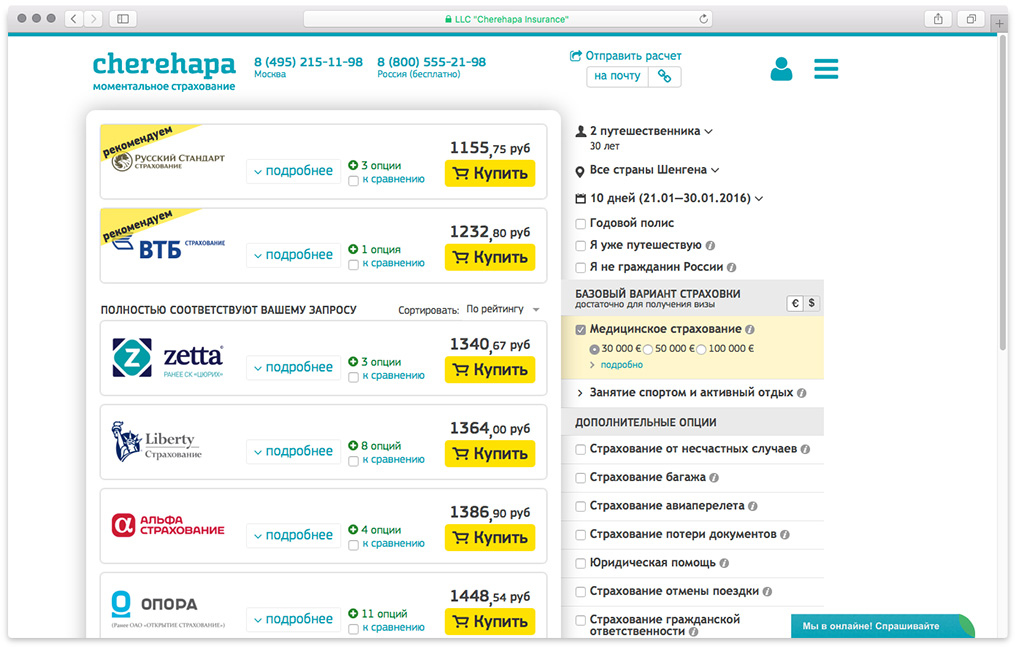 Удобно, что страховой полис можно купить прямо на сайте. А с помощью удобного конфигуратора можно выбрать только те страховые опции, которые вам нужны.