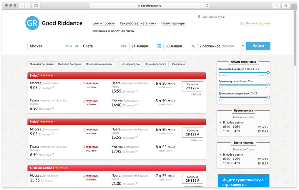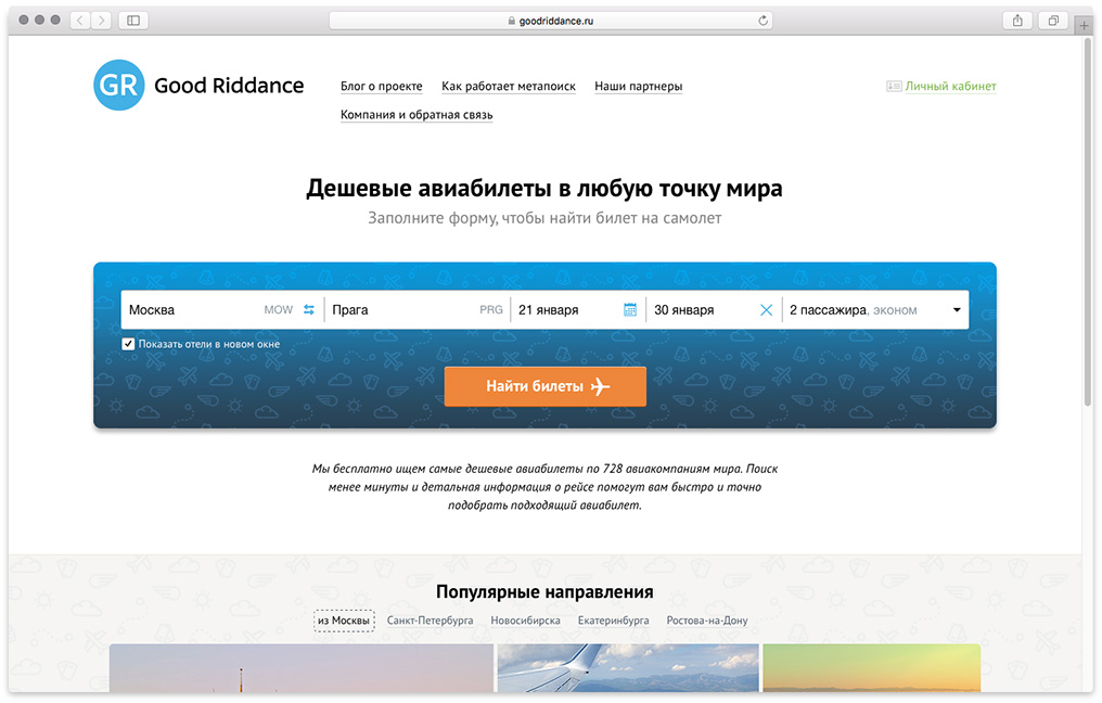 Следующий шаг в подготовке отдыха — покупка авиабилетов. Найти наиболее выгодные предложения поможет наш поисковик goodriddance.ru. Выбираете, откуда летите и куда, число пассажиров и даты. А мы делаем запрос к авиакомпаниям и находим для вас наиболее выгодные варианты перелета по заданному маршруту.