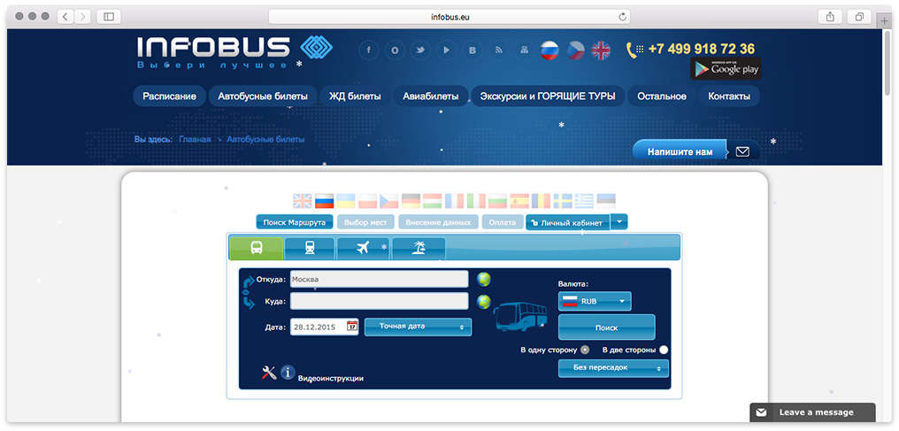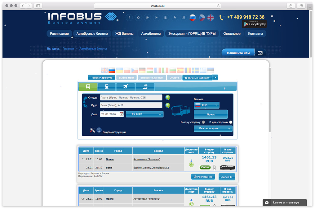 Кто-то ездит в булочную на такси, а кто-то предпочитает более демократичные виды транспорта, такие как автобусы и электрички. Найти наиболее доступный и удобный вариант в этом случае поможет международный сервис infobus.eu. Здесь вы сможете подобрать маршрут и сразу забронировать билеты на определенную дату. Автобусом в Европу? Вполне реально, хотя и не очень удобно. Добраться из одной столицы в другую? Не только реально, но и гораздо дешевле, чем на такси.