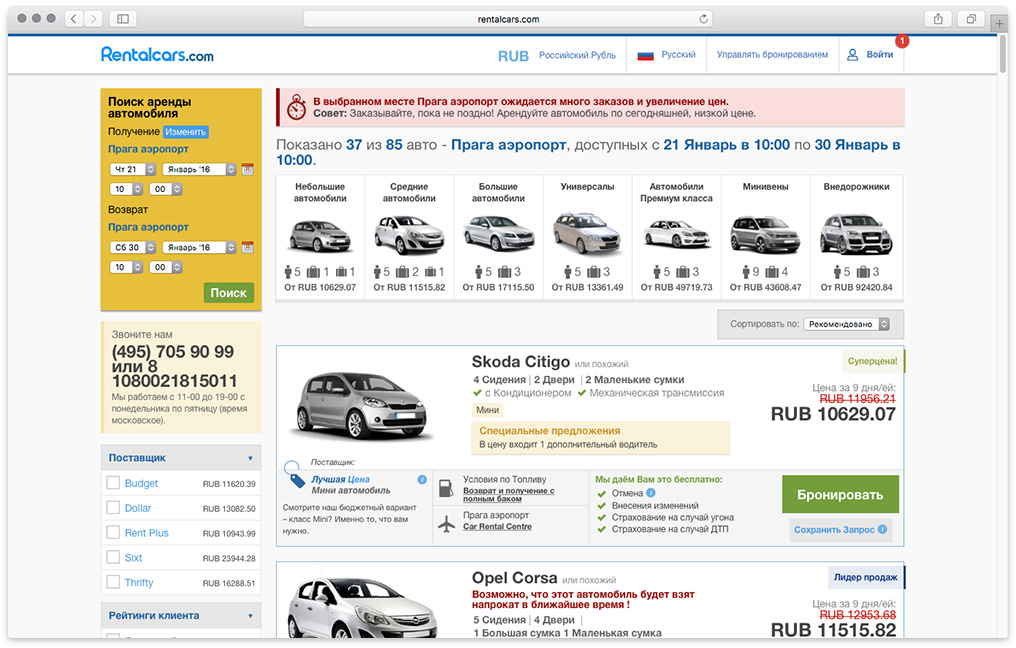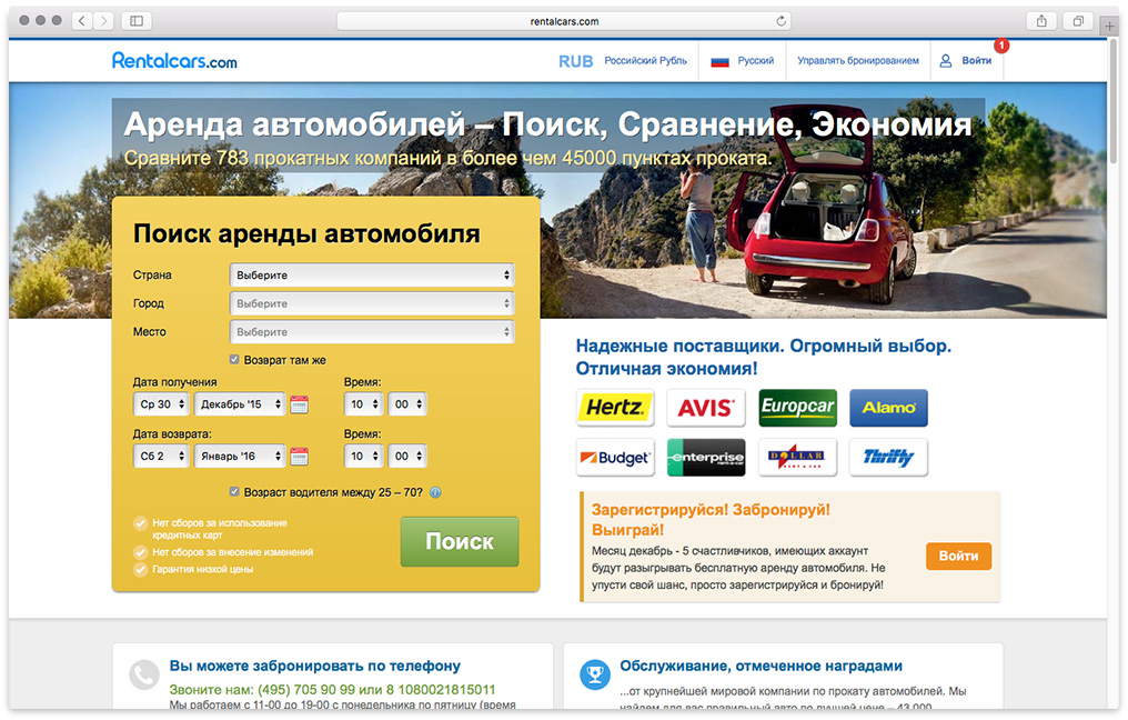 Сервис обрабатывает данные сотен международных и местных служб проката автомобилей по всему миру. Пара кликов мышью — и у вас перед глазами удобно сгруппированный список автомобилей на прокат. Осталось выбрать самое выгодное предложение.